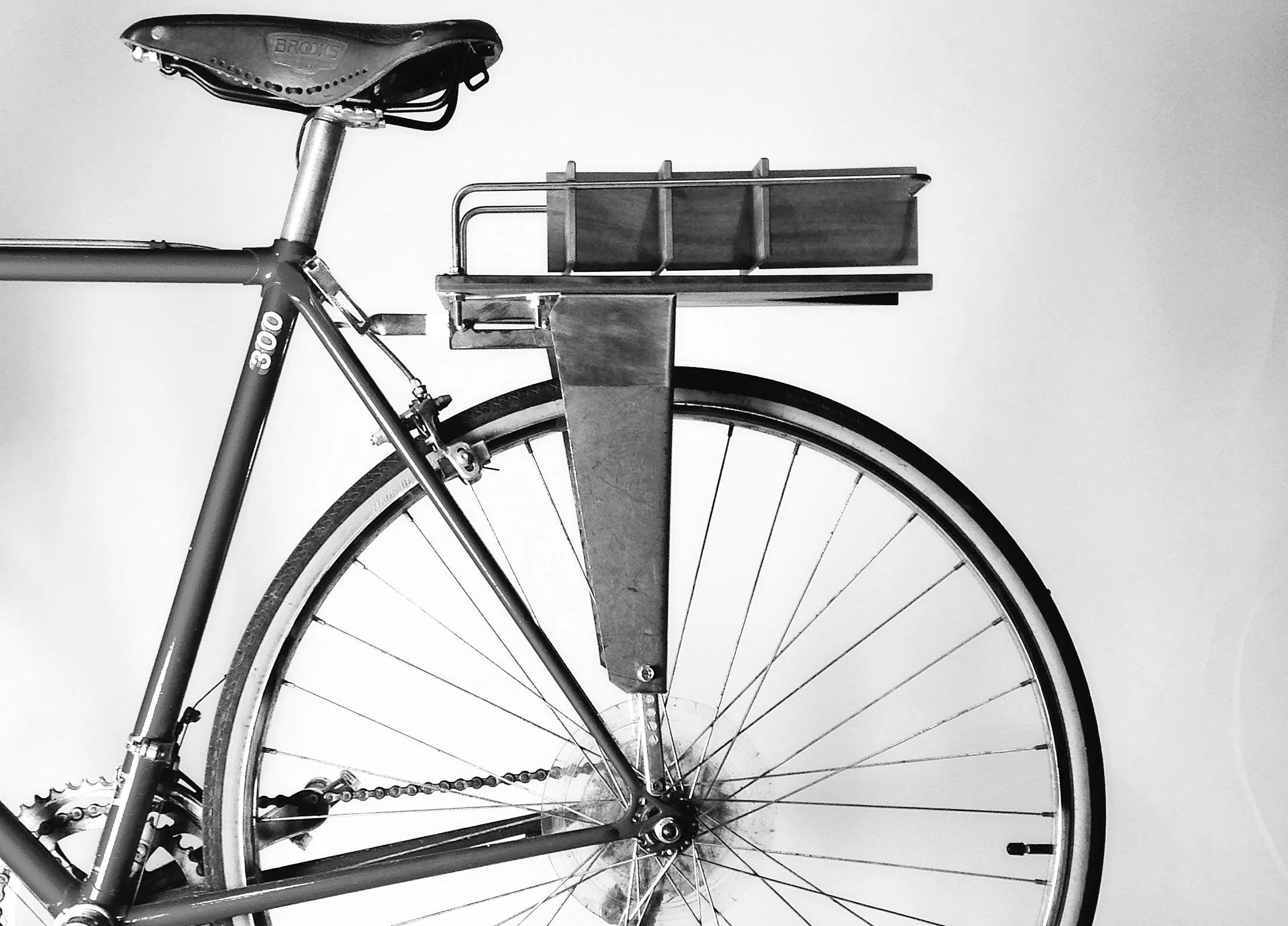 c. 2016 The bike rack was produced out of necessity. It provides housing for a set of four craft beer (or alternative beverage) bottles for the hipster in our lives. The bottle holster is detachable enabling the bicycle rack to support and secure alternate cargo. The object is constructed out of a ply-walnut slab, maple bottle holster, folded stainless steel plates acting as the supports and stainless steel rod employed as the guard rail.